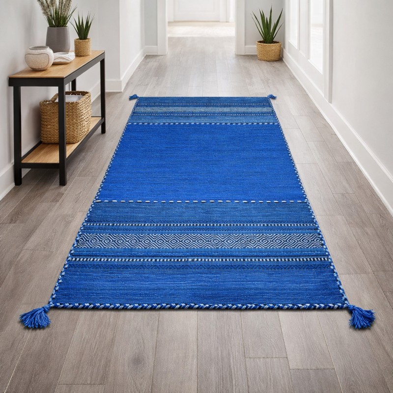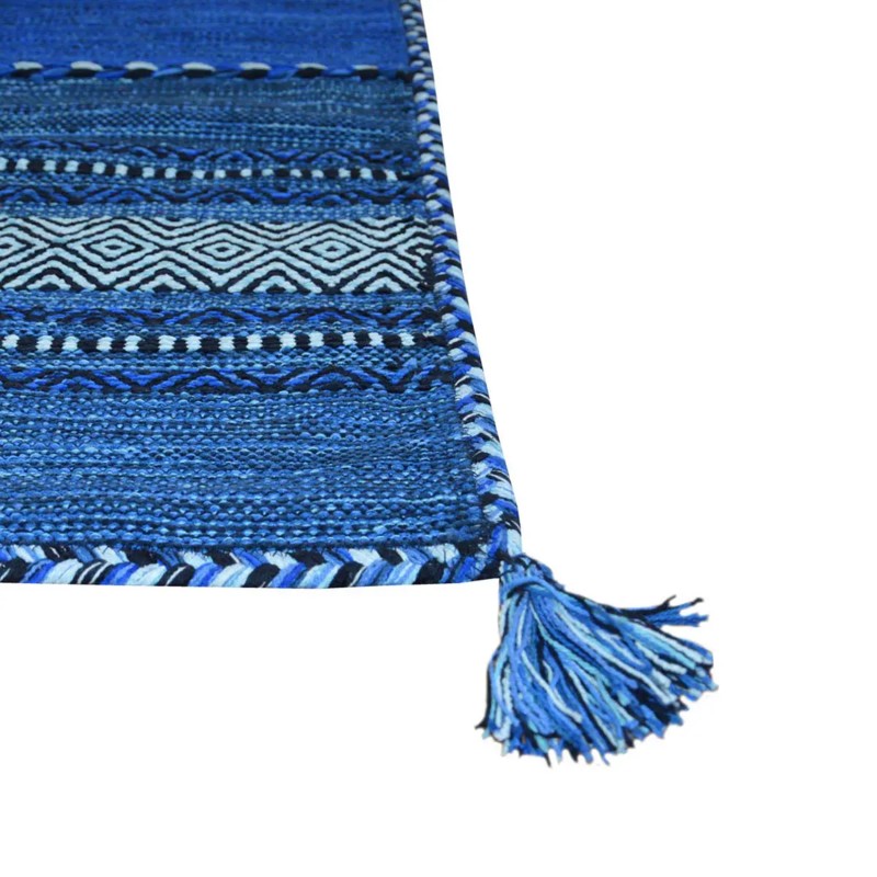 KILIM OLD - Tappeto Artigianale Annodato a mano con frange - Ciniglia & Cotone - BLU