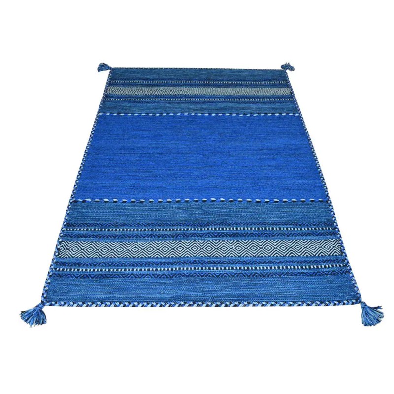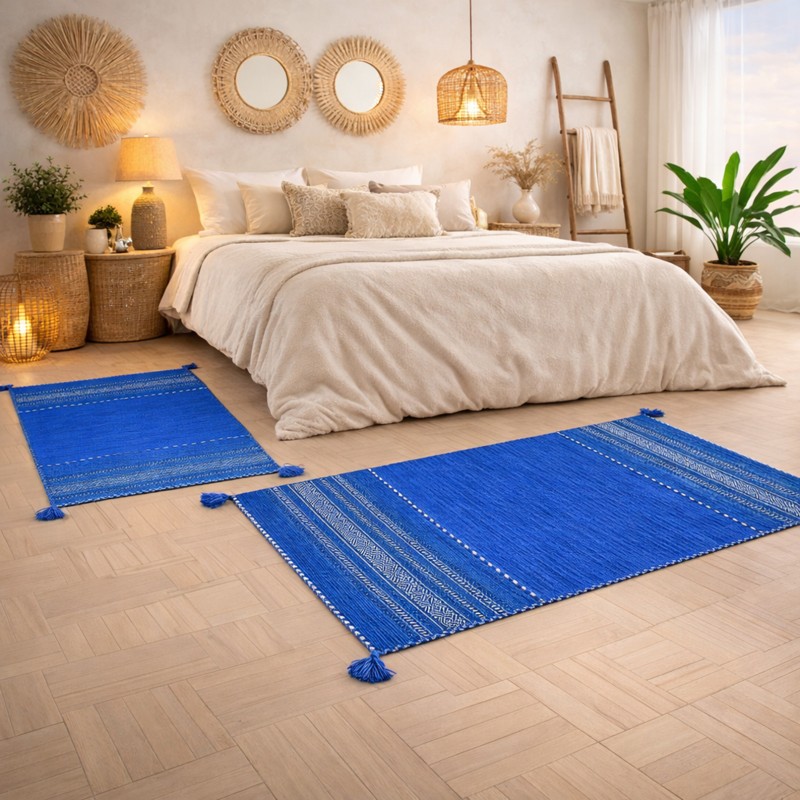 KILIM OLD - Tappeto Parure Scendiletto Artigianale Annodato a mano con frange - Ciniglia & Cotone - Blu