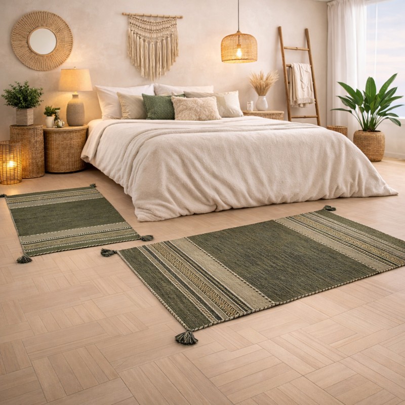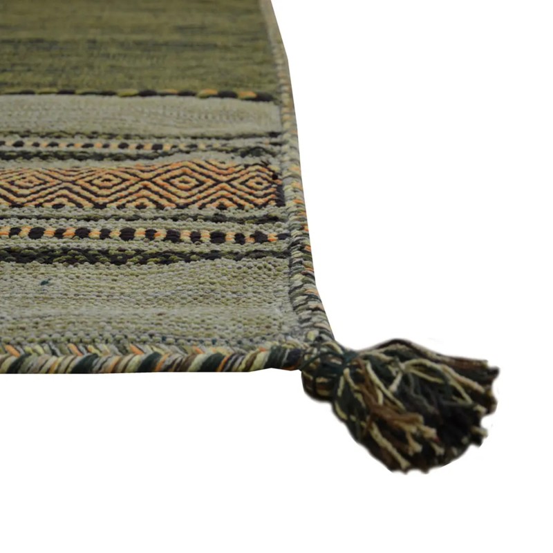 KILIM OLD - Tappeto Parure Scendiletto Artigianale Annodato a mano con frange - Ciniglia & Cotone - Verde