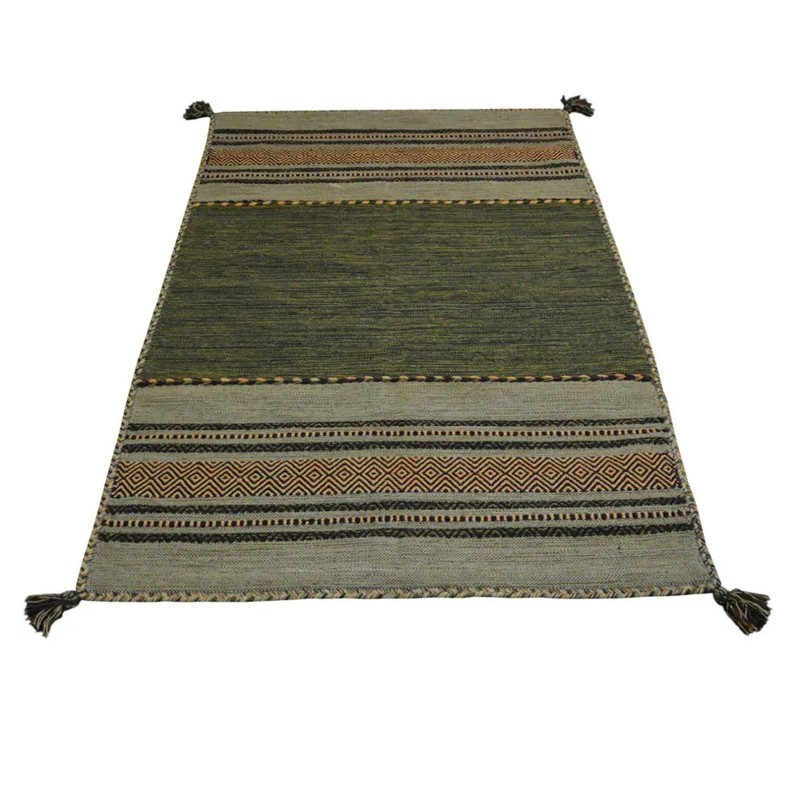 KILIM OLD - Tappeto Corsia Passatoia Artigianale Annodato a mano con frange - Ciniglia & Cotone - Verde