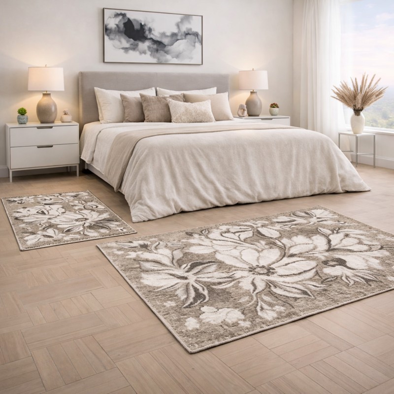 ASTRALIS - Tappeto Parure Scendiletto Moderno Floreale - Lavabile ed Antiscivolo - Tortora